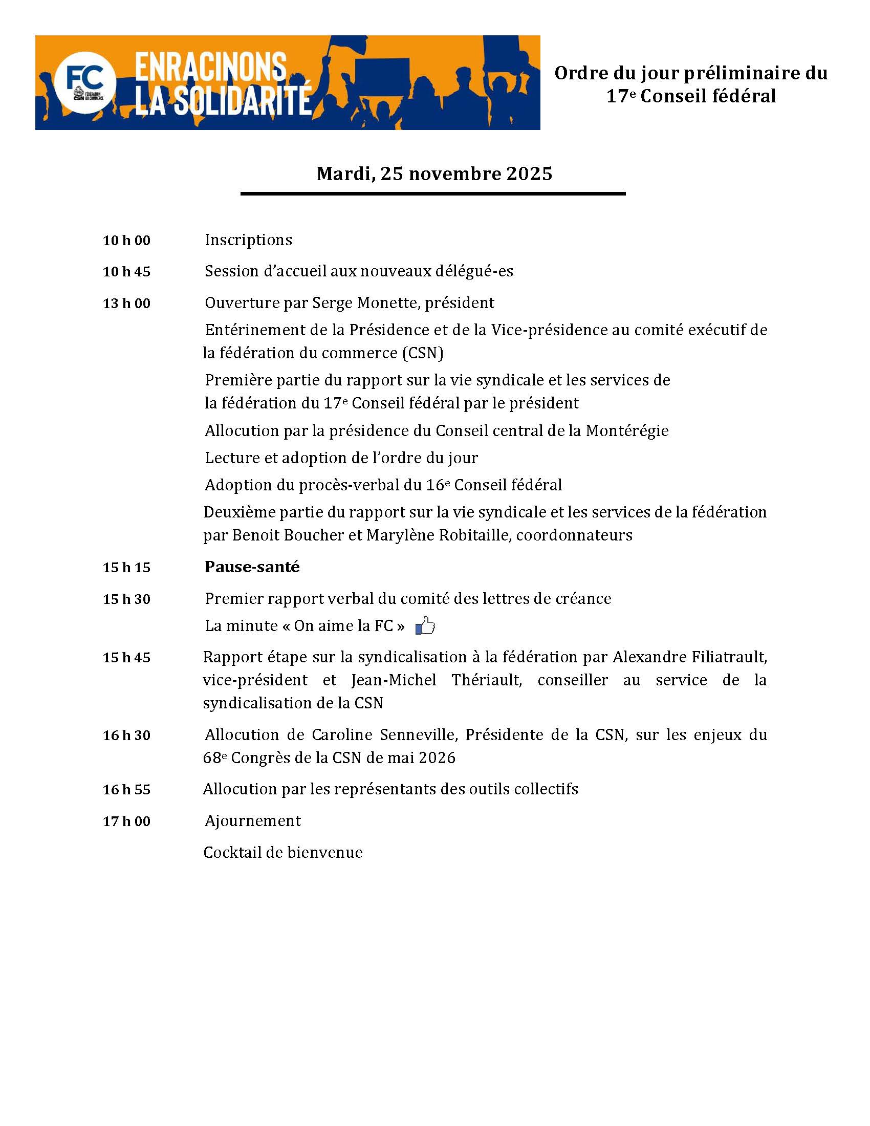 Le 17e conseil fédéral aura lieu du 25 au 28 novembre 2025, à Valleyfield. Les inscriptions seront lancées le 10 octobre 2025. Vous recevrez alors une convocation avec un lien pour vous inscrire sur le portail. Puis, quelques jours avant l’événement, les documents pertinents à la rencontre seront déposés ici, afin que vous puissiez les consulter. 👇